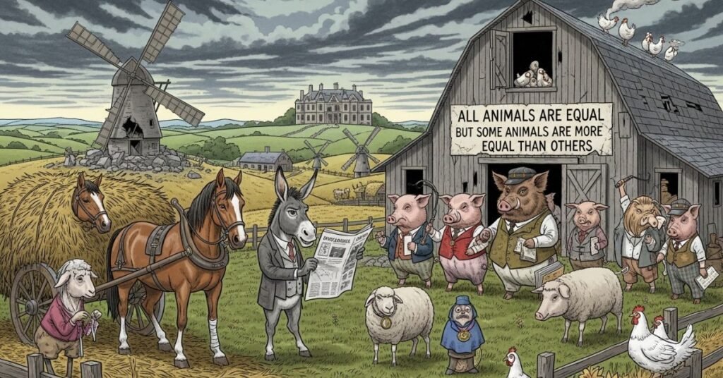 As years passed, the farm changed. The pigs learned to walk on two legs, wear clothes, and carry whips. They changed the commandments again until only one remained: “All animals are equal, but some animals are more equal than others.” The other animals could no longer remember the early days clearly. The faces of the pigs started to resemble humans. They drank, gambled, and invited neighboring farmers to dinner. The animals, watching from outside, couldn’t tell who was pig and who was man.